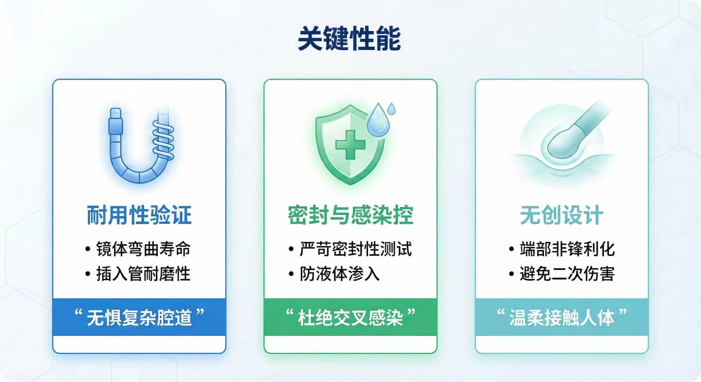 镜体弯曲寿命、插入管耐磨性、密封性(防液体渗入)关系到复杂人体腔道中的耐用性与感染防控。直接接触人体的端部非锋利性更是避免了手术过程中对人体的二次伤害。
